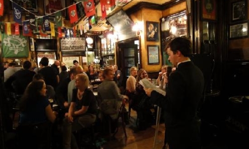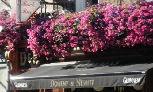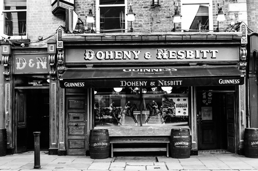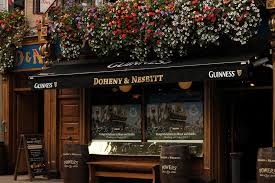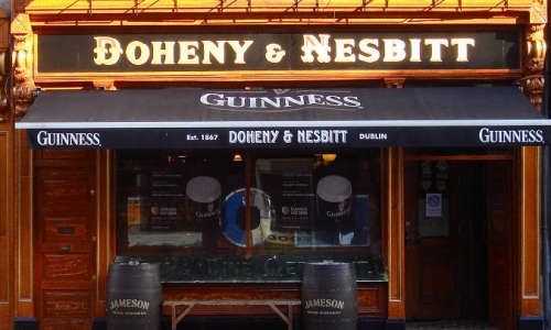 Located on one of Dublin’s most famous streets – Baggot Street, Doheny and Nesbitt public house is surrounded by renowned landmarks – The Dail (House of Parliament), Grafton Street, Trinity College, Stephen’s Green and Lansdowne Road. Otherwise known in literary and debating circles as the ‘The Doheny & Nesbitt School of Economics’ is situated a few hundred meters from the old Huguenot cemetery on Merion Row(1693). Probably the most photographed pub in Dublin, Doheny & Nesbitt is considered an institution for convivial gatherings a sanctuary in which to escape the ravages of modern life, and a shrine to everything that is admirable in a public house. As a Protected Structure and unique example of Victorian pub architecture, the Doheny & Nesbitt public house demonstrates that skilful conversation can rest easily alongside modern commercial demands. Most of the pub’s original features, both inside and outside remain intact. Its distinct Brass sign ‘Tea and Wine Merchant’, as well as the frieze boasting ‘Doheny & Nesbitt’ have spawned countless posters, postcards and guide books paying homage to this asset of Ireland’s capital city If Ireland invented the pub, then Dublin’s finest showpiece is that of Doheny & Nesbitt. The main bar retains the original counter, and almost all of the original fittings date from the 19th century. The pub’s carved timber, aged wooden floors and ornate papier-mâché ceiling, recently restored, are universally admired. Its snugs and mirrored partitions are perfect for scheduled conversation, and one can easily muse on Ireland’s past Writers (Yeats, Behan, and Shaw) and Politicians debating and plotting in these hallowed surroundings. Writers and Politicians from the nearby Dail or House of Parliament still frequent this pub, as do journalists, lawyers, architects and actors, along with a myriad of visitors from around the globe. What attractions contribute to this pub’s character are debated by many; its perfect pint of stout, its array of Irish whiskeys, it’s comforting dark mahogany and glass furnishings, its reverence for the barman – customer relationship. What is in no doubt is that it is hot on the hit – list of tourists’ and locals’ itineraries – a ‘must-visit’ whilst in Dublin. The building itself dates back hundreds of years, but was born as a public house in the 1840′s under the lease of a William Burke, who ran it as ‘Delahuntys’ for almost 50 years. In 1924, Messrs Philip Lynch and James O’Connor took it over for around 30 years, before passing it onto a Mr Felix Connolly. Ned Doheny & Tom Nesbitt, two Co. Tipperary men took over the reins of the public house at a later date up until its present owners, brothers Tom and Paul Mangan. Interestingly the embossed lettering on the mirror to the rear of the main bar, originally bore the name O’Connor, but was later altered to Connolly and remains so to this day. Although the owners of this public house have come and gone, good sense has always prevailed that the landmark of Doheny & Nesbitt should remain just so. Doheny & Nesbitts public house may reflect the characteristics of a bygone age, but this is no museum piece. An increased patronage has secured a Victorian replica bar to the rear, which is complemented by modern conveniences such as large plasma screen TV’s to cater for the pub’s many sports enthusiasts, and lunches to refresh tourists, workers and shoppers alike.