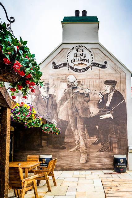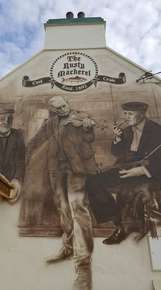 The Rusty Mackerel is a renowned Traditional Irish Bar & Restaurant made famous for its traditional Irish music, food, warm & friendly atmosphere with a vibrant mix of both locals and visitors at the foot of the Sliabh Liag Mountains. With music 7 nights a week, locals and visitors are invited to join in or sit back and enjoy a ‘Silkie’ in the surrounds of the rustic interior with character and characters! With some great musicians and Irish dancers of their own who often like to join in for the ‘craic’. Our Menu reflects the best seasonal local produce Donegal has on offer served in the flag-stoned bar with fish caught at night and delivered fresh to our door every morning. Local craft beers from Kinnegar & Ballayshannon Brewing Company, the legendary ‘Silkie’ Irish Whiskey & An Dúlamán Maritime Gin distilled less than a mile away are one of the many drinks on offer, either by the open turf fire in winter or outdoor seating area overlooking Sliabh Liag on sunnier days. Our ‘Unique’ 5* Accommodation consist of Double & Triple Rooms, en-suite with Shower and Wi-Fi, Parking to include Full Irish Breakfast at affordable cost for travellers and couples alike to explore South Donegal & the Wild Atlantic Way. All Rooms are designed to provide Comfort & Relaxation with private Courtyard Area. We cater for all events with an additional covered outdoor heated area with menus designed for every taste. It is enriched by the many and varied characters who have been frequenting this establishment for decades, with many now portrayed on our exterior walls making it an iconic backdrop for photographs. Today, after sensitive restoration, it has retained some of the best characteristics of the past and makes a perfect stopping place. Our reputation is built on the delivery of quality food, fine service and the best of traditional Irish entertainment.