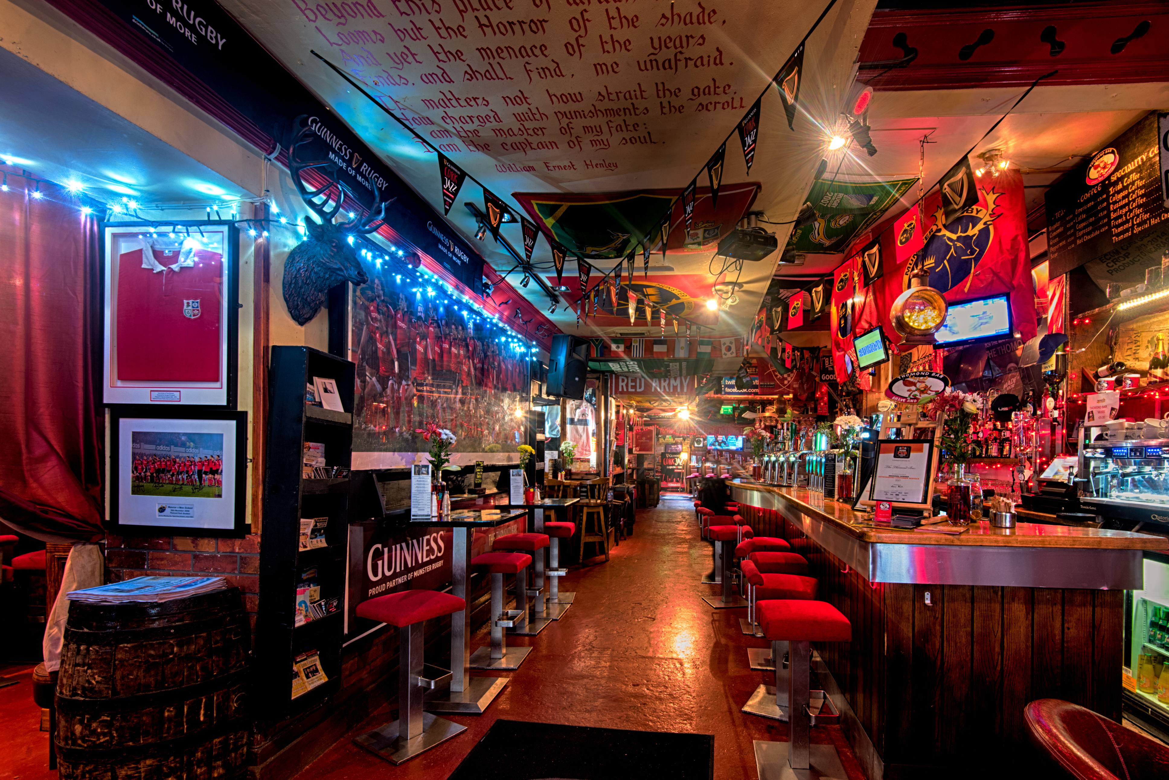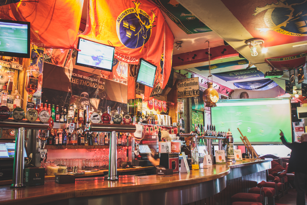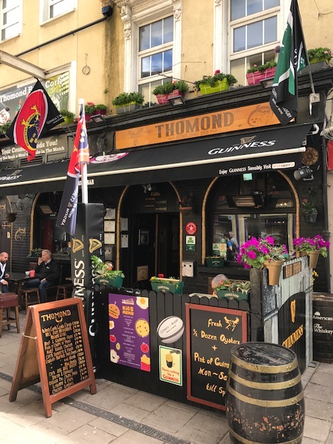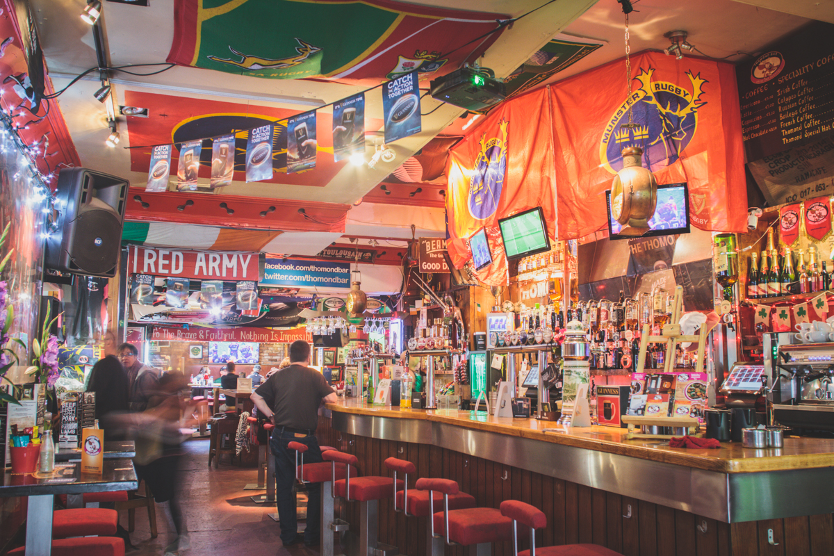 The Thomond Bar situated in Cork City Centre is an outstanding example of a traditional, well run Irish Pub. We are situated in Marlborough Street just off Patrick Street. Cork City’s main shopping street. Food and Beverage: All day dining is a top feature of the bar, with a full menu available without interruption from 12 noon to 10m. This is served all day and by romantic candlelight from 6pm. Weather permitting, you may dine outside in the peaceful pedestrianised Marlborough Street. We extend a sincere welcome to newcomers and regulars alike. First time visitors will understand why the Thomond bar has been showered with awards and rave reviews. Interesting combinations are a distinctive style of our food menus. Traditional Irish fare produced from local farm produce who, we believe, share our passion for the freshest of products. Products which provide the foundation of our much talked about food that is enjoyed all day every day in the bar. Our locally sourced food is served in a friendly and relaxed atmosphere. It is the ideal venue for a meal or get-together with friends. The cuisine is traditional Irish with a modern European flavour and the menus feature many traditional Irish dishes such as beef and Guinness stew and Bacon and cabbage as well as Vegetarian Menu option. Our beverage choice is extensive with Beer, wine and spirits from near and far. Profile Description Entertainment: Weekends offer something for everyone from live bands, DJ’s and karaoke preceded by all sporting events beforehand. Every weeknight at 9:20pm, the Thomond Bar is the venue for a lively traditional Irish ballad music session, which is attended by locals and visitors from all over the world. There is a traditional song from Ireland about ‘Digging for gold in the street’. We make sure you don’t have to dig or look very far for this treasure as we work very hard to make The Thomond Bar the gem right in the middle of the City of the Blarney Stone. Warm conversation and cool refreshing drinks are also our speciality. We have an extensive Tourist Information section in the bar to assist you in making your stay both enlightening and entertaining. We are Great Sport: If the main theme running throughout the bar is Munster Rugby all sport plays an important part in the life of The Thomond. Customers can make use of the free Wi-Fi facilities and enjoy live coverage of all popular sporting events on the large screens throughout the week on a range of channels, such as RTE Setanta, ESPN and Sky. Our motto is: Good Atmosphere & Great Food and Drinks. Doing everything possible to make your visit a memorable one in our beautiful city, your home away from home by the Lee. Local Attractions: 2 min walk from the English Market (Corks World famous multicultural food market) 10 seconds walk form Patrick Street (main Shopping street)
